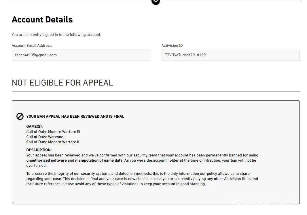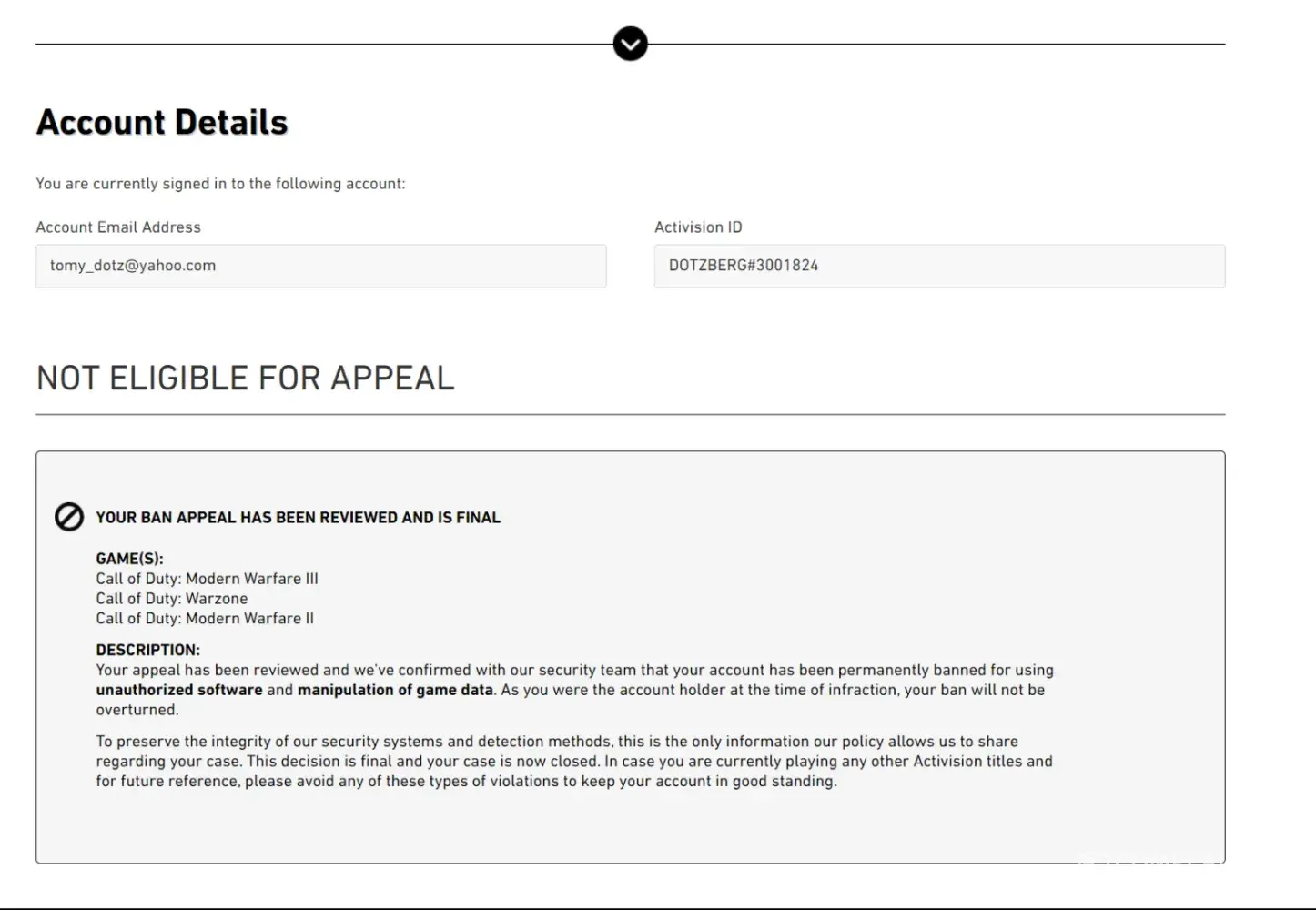 So I am currently permanently banned from a game I have never cheated on and never in any way manipulated the game data of. Activision support has been very unresponsive in this entire process. If there is any reason for me being banned under this condition it would be because I changed my account email from my fathers to my own, both containing my last name in it. Not to mention there is zero reasoning for me to be banned in MWII as I do not have it downloaded, if you would be able to provide me any clarity on this widely experienced issue it would be greatly appreciated.