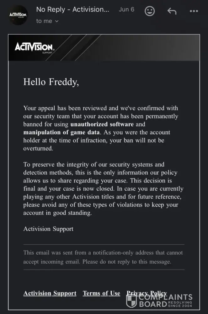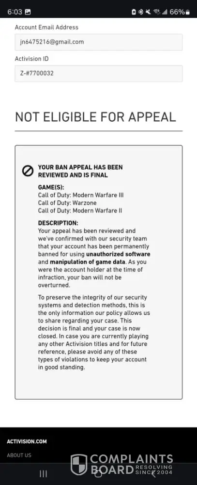 I reported through battle.net and activision that my account had been hacked in March 2024. I managed to recover my account by unlinking the steam account and email that the hacker tried to use. Following this, it appeared that I had been banned by Activision for violation of terms. Upon appeal, I recieved an email back to state that: "Your appeal ha...