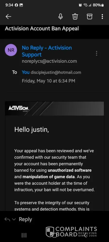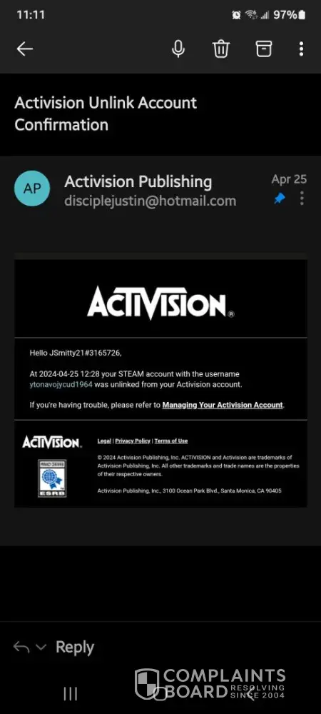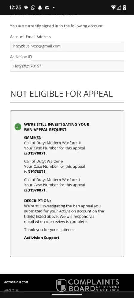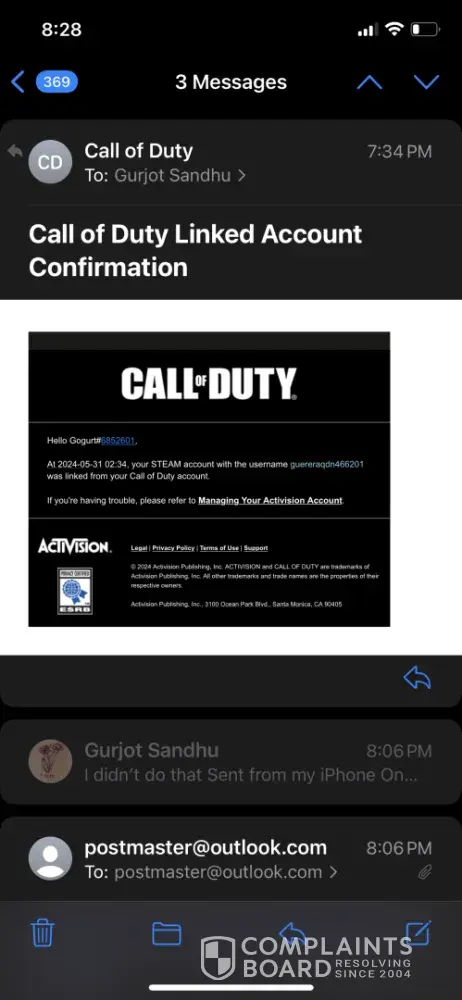 I have been playing Call of Duty for over a decade with the same Activision account, purchasing the new CoD every year. I have never hacked or used any cheats in my life. Activision states that ‘Bans will only be overturned if we determine the infraction was due to unauthorized activity on your Activision account.’ Someone gained access (hacked) into my Activision account and linked their Steam account to it, which resulted in my account getting permanently banned. I appealed my ban but was denied only a couple hours later with a generic response. I submitted proof to Activision, through the Better Business Bureau, showing someone hacked into my account. I also submitted a complaint through the California Attorney General. However, Activision has failed to look into the matter and have been unresponsive for a couple weeks.