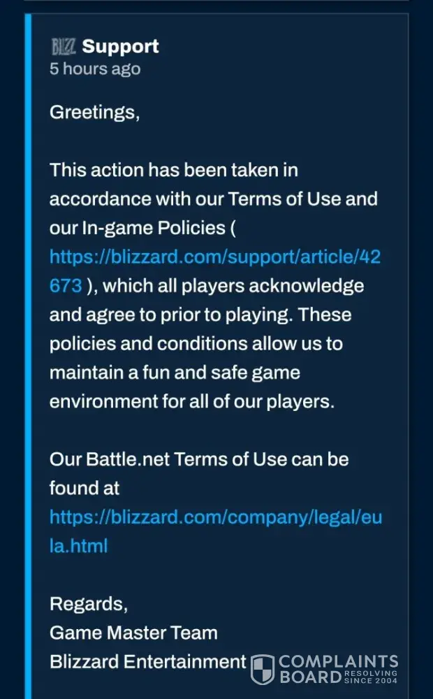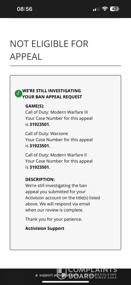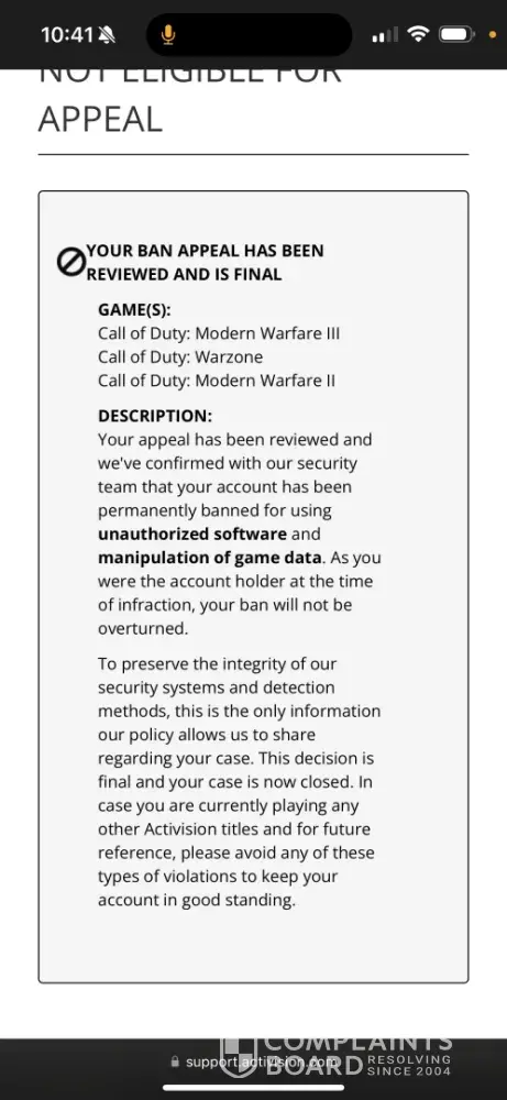 I have appealed my ban on Activision's site, still banned. I sent a formal complaint to battlenet, still banned. I even tried reaching out to them on twitter/ x. Nothing. As I live in the UK, I can't send a complaint to BBB (seeing as Activision only listen to them) unless I spoof my phone number, which is getting more and more tempting. The only issue is that's probably going to cost me.
