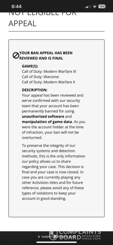 It happened on June 7th 2024. I was planning to play some call of duty modern Warfare 3, well I was about to, when all of a sudden I got a message saying that I was temporarily banned on the call od duty loading screen, made me wondered what I did wrong. So I went to Activision website and appealed for ban over there, after reviewing it, it got denied and it said that I'm permanently banned from playing call of duty and they won't overturn the ban. The reason they gave that I using unauthorised software and manipulating the game data. To be more specific I'm a console player and it's impossible to use random software on my console, I tried contacting activision customer support but nothing works. It just made me more frustrated, makes me think that activision is not willing to help. I hope they do smth about it.