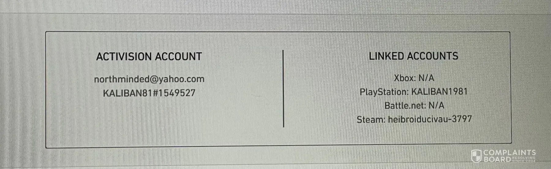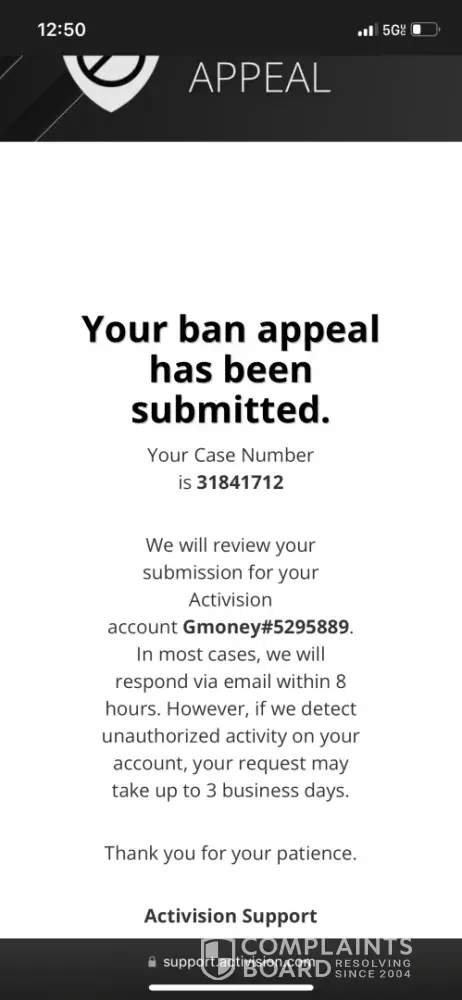 Hello, my name is Brad Duran. My Activision account was compromised on 4/27/2024. I received an email at 3:38PM MST stating that a Steam account with the username "river26blickgqk" had been linked to the Activision account. This is not my Steam account and I did not have my Steam account linked because I only play on Battle.net or Playstation. I had last played Call of Duty on my account on Battle.net at approximately 3:00AM MST was when I got off. Upon attempting to log back in on Battle.net around approximately 9:00PM MST on 4/27/2024, I was notified via email that my account had been permanently banned. I submitted a Ban Appeal but received an email stating that it would not be overturned even though I had stated that my account was compromised in the Appeal. I submitted an account recovery request, case number [protected], to which I got an email reply stating that the company was unable to process my account recovery request because they did not detect any suspicious activity on my Activision account. Shortly after finding that my account had been compromised, I changed the password to my account to prevent anyone else from accessing it. Around the same time of submitting the account recovery request, I filed a complaint with the Better Business Bureau, ID Number [protected], to which the company replied, stating that the report was being investigated and once my account was restored I would receive and email and they would have a resolution for me within 24 hours. I did not receive anything from the company for 4 days until I finally got the email stating that they were unable to process the request. The only contact I've had with the company is through these apparent automated emails as well as what seems like an automated response to the Better Business Bureau complaint. I have not been able to contact an individual from the company to discuss the situation nor has the company clarified what alleged software and manipulation of game data caused the account to be banned or the date or time it was detected. Below I have listed the Activision account information that has been banned, as well as the account recovery request case number and the complaint ID through the Better Business Bureau. I have also filed a complaint with the California Department of Justice.