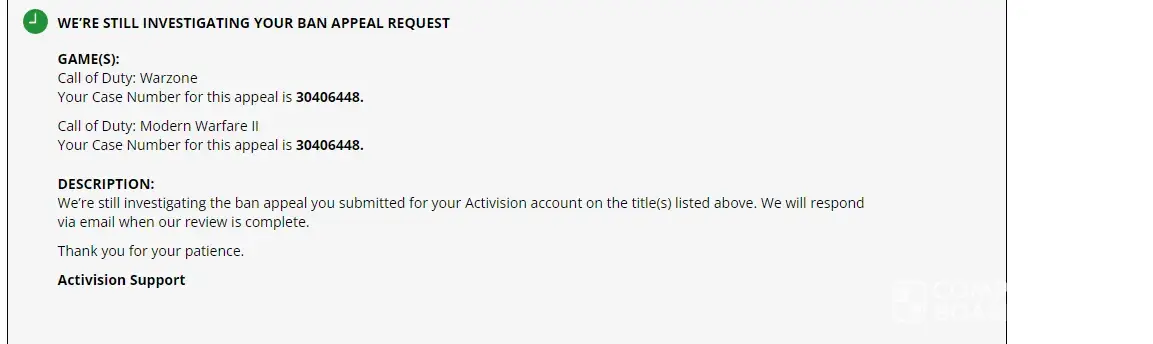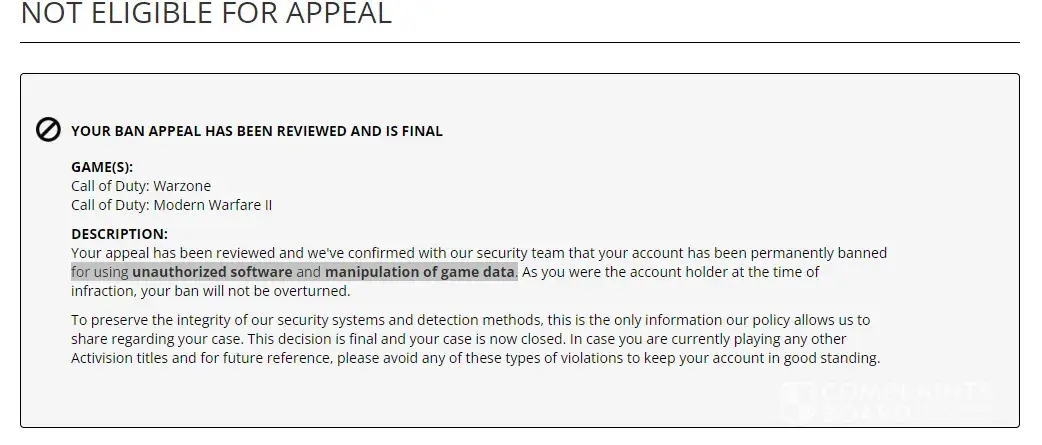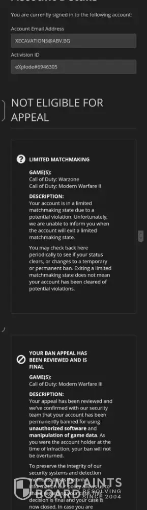 10/19/2023 - 1:22PM CT My account was banned after an appeal had been submitted, I offered to provide credible proof from my computer that I have never manipulated their game files, and game data to gain a competitive edge on others. I emailed multiple people within the company that have since not contacted me. The company by law has to provide the data used against me to show why I was banned, as I use software that allows for me to route games for speed running like Lies of P and Dark Souls. This engine does not touch/manipulate any Call of Duty files.