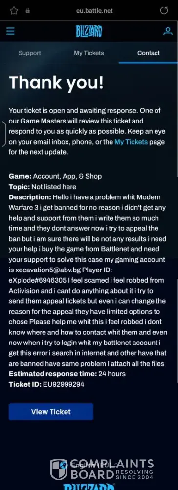 Desired outcome: To fix the ban my account and allow me to sign into Activision.
