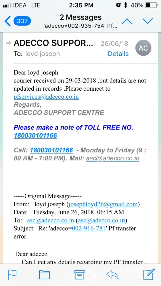 I had requested to transfer my PF amount to current Pf account so I have submitted all the documents by courier and got acknowledged on 29/3/18 adecco Bangalore (Karnataka state INDIA) and so far nothing happened so I called today on 18/9/18 and now they are telling forms are not received..