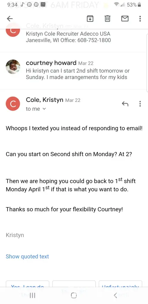 I understand all that has happened, I understand that Adecco does no tolerate Un-called for behaviors, & I completely respect that Coming from 24 years of being raised by a Marine. I understand right from wrong, Respect & manners will take you a long way. I'm told quite often that i am a hard worker and very respectful. CST Storage has even vowed for the work & respect i carry at their company. & that they would like me to return.