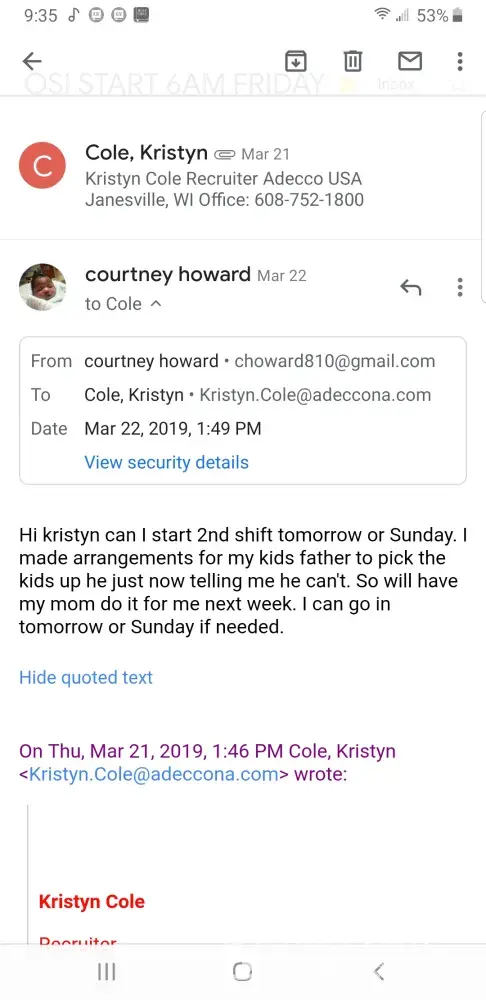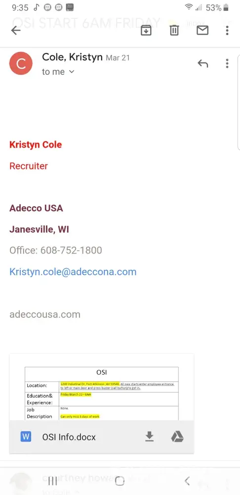I was placed an assignment at OSI awhile back. The first day I went I stood at the office window for 15 minutes. While they sat in there laughing and then I just went on in. I was told to go sit in the lunchroom someone would come get me to start. I sat there over an hour no one ever came, so I went outside to my van and called adecco. She apologized for their rudeness and said it must of been a misunderstanding on OSI part. That she would start me another day. I told her I'm not interested in working for a company like that. Somehow she still had me down to drive a hour away the next day after already driving there for no reason. Then turned around and put me down as a no call no show for the 2nd day. Knowing they messed up and said I can't be placed anywhere for a couple months when I called today. Trying to figure out why the first day wasn't mentioned in these notes and while they can't admit they're fk up. I don't like liars or people to switch the situation so they can look good I can be reached at [protected]. I have all my messages and screenshots from that day I don't erase anything