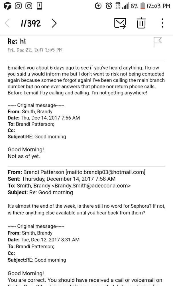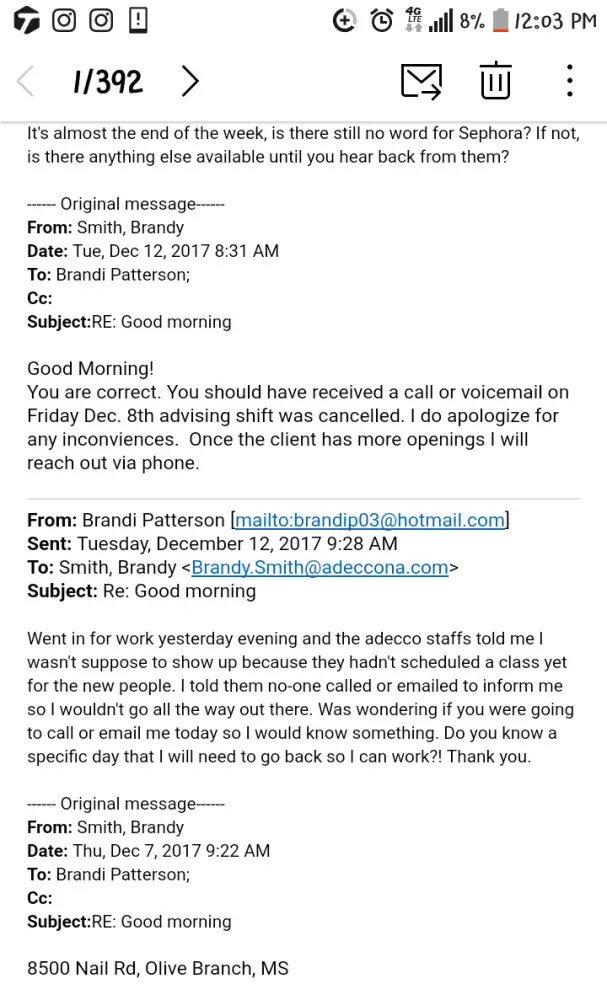 My name is Brandy Pearson, I came in for an interview November 30, 2017 on a Thursday. Waited for my drug test and background to come back which I passed everything. December 5th is when I heard back because I TOOK UPON MYSELF TO CALL BACK SINCE I HADN'T HEARD ANYTHING! The job is for Sephora in Olive Branch Mississippi. Ok, she told me to go in that following Monday to work! Monday comes, I drive out there for the people at Sephora to tell me I WAS NOT SUPPOSE TO BE THERE, SOMEONE AT THE AGENCY SUPPOSE TO HAD TOLD YOU NOT TO COME BECAUSE WE HADN'T GOT THE CLASS SCHEDULED FOR NEW PEOPLE! OK...IM PISSED! My recruiter who I'm suppose to stay in contact with name is Brandi Smith, she works at Adecco on Shelby Dr in Memphis Tn. I email her and tell her why no-one told me not to show up she says; someone should have told you...YES SHE WAS SUPPOSE TO HAD TOLD ME! Every since December 5, 2017 I have not been to work and it is now December 23, 2017. I've emailed this woman and SHE HAS NOT BEEN RESPONDING! I have been calling the Branch main number AND THEY NEVER PICK UP THE PHONE...I HAVE EVEN LEFT MESSAGES AND NOBODY HAS RETURNED MY CALL. THEY ARE UNPROFESSIONAL! I WANT TO WORK...MY NUMBER IS [protected] PLEASE CALL ME. I HAVE SAVED MY EMAILS. I CAN SCREENSHOT MY CALLS. A whole month...I know she have heard something by now. Seems to me that she read my emails and realized she didn't contact me AGAIN so now she just avoiding me. Smh she needs to be fired..I really want to work, its already hard to get a job without going through a temp agency. Its not fair!