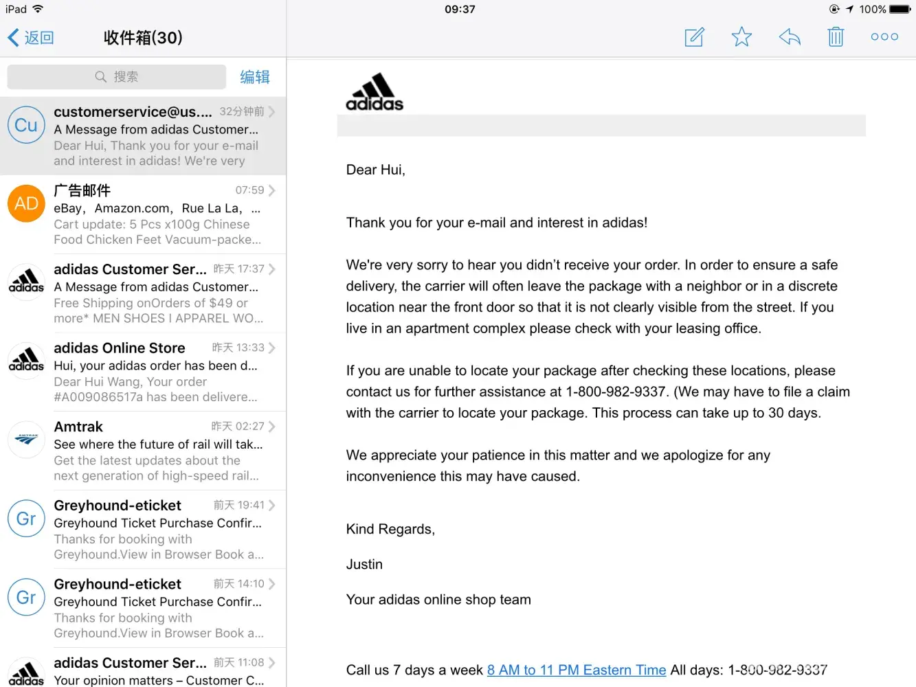 I ordered a pair of shoes through adidas.com/us on September 25th, and on September 28th I received a letter saying that my order has been delivered, but actually I really didn't receive.I asked the customer service where my order is, they just can solve my problem and they cannot assume responsibility for lost shipment and the service is really bad!