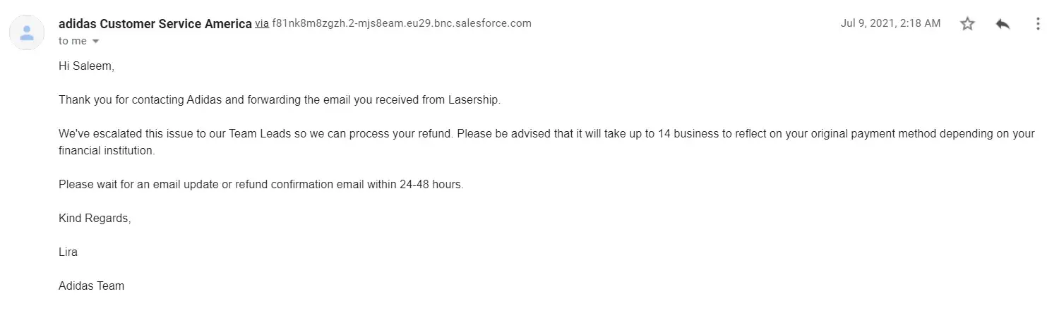 I have ordered a pair of shoes on 06/01/2021, The shipping company "Lasership" has delivered the package to a wrong address and they were not able to recover the package. I got an email from Lasership stating what actually happened. I have forwarded the email to adidas for the refund on 07/07/2021. On 07/09/2021 I got an email from adidas stating that I'll getting a refund with in 14 business days. Till now I haven't received the refund. The adidas have the worst customer service in USA. I'll be attaching the screen shots of the E-mail I got from adidas