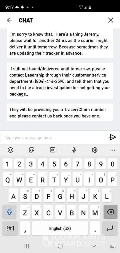 Lasership admitted to me over the phone that they lost the package. However, they failed to upate their tracking sytem to reflect that they lost the package. On the tracking information, Lasership noted that the package was delivered to the warehouse, and then in a one minute time span, it was loaded on the delivery truck, and in the next minute, it was allegedly delivered to my house. Laser ship was alleging that they delivered my package in the time span of 3 minutes. This is obviously impossible.