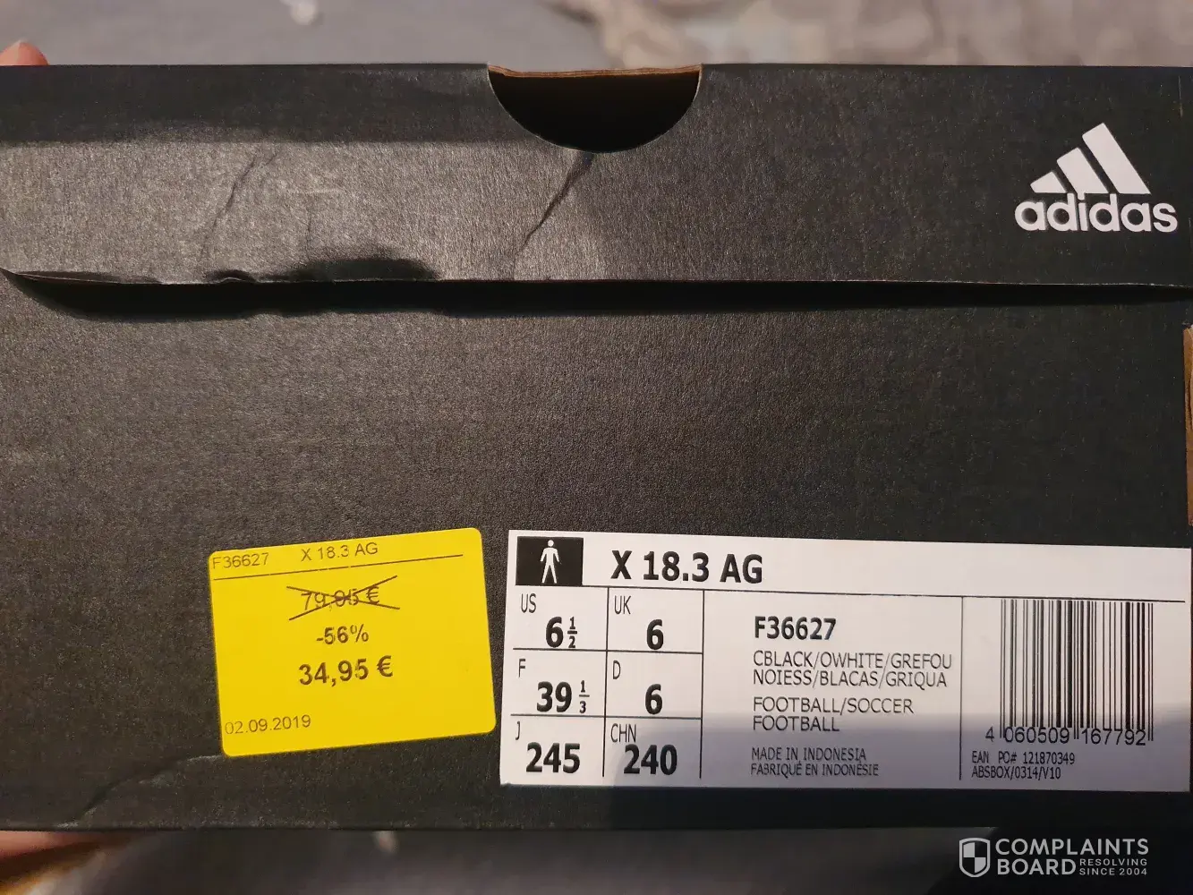 On 28/10/2019 I bought football shoes at the Adidas outlet store in Designer Outlet Parndorf in Vienna. To the cashier, I brought a box with shoes with a price tag of 34.95 euros. I paid for the product with a card and because I was in a lot of a hurry I didn't pay attention to the bill, thinking everything was okay.