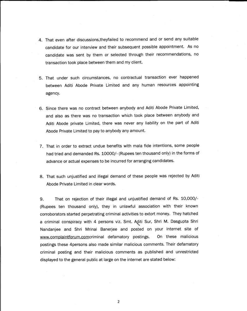 Suddenly aditi abode private limited stated hire candidate from us. We accepted their proposal and started to send the resumes and candidates to this company against their vacancies of cement segment and hotel segment. After that continious got the complains from market that aditi abode private limited is fake compnay; they dont have own cement plants and hotels without a single lease property in lataguri. From our candidates we got informations this company cheated many staffs salary time to time. Mr. Tanmoy banerjee and mrs. Sweta choudhury cheted few job consultants. We allert all candidates and placement consultants not to tie up with them.