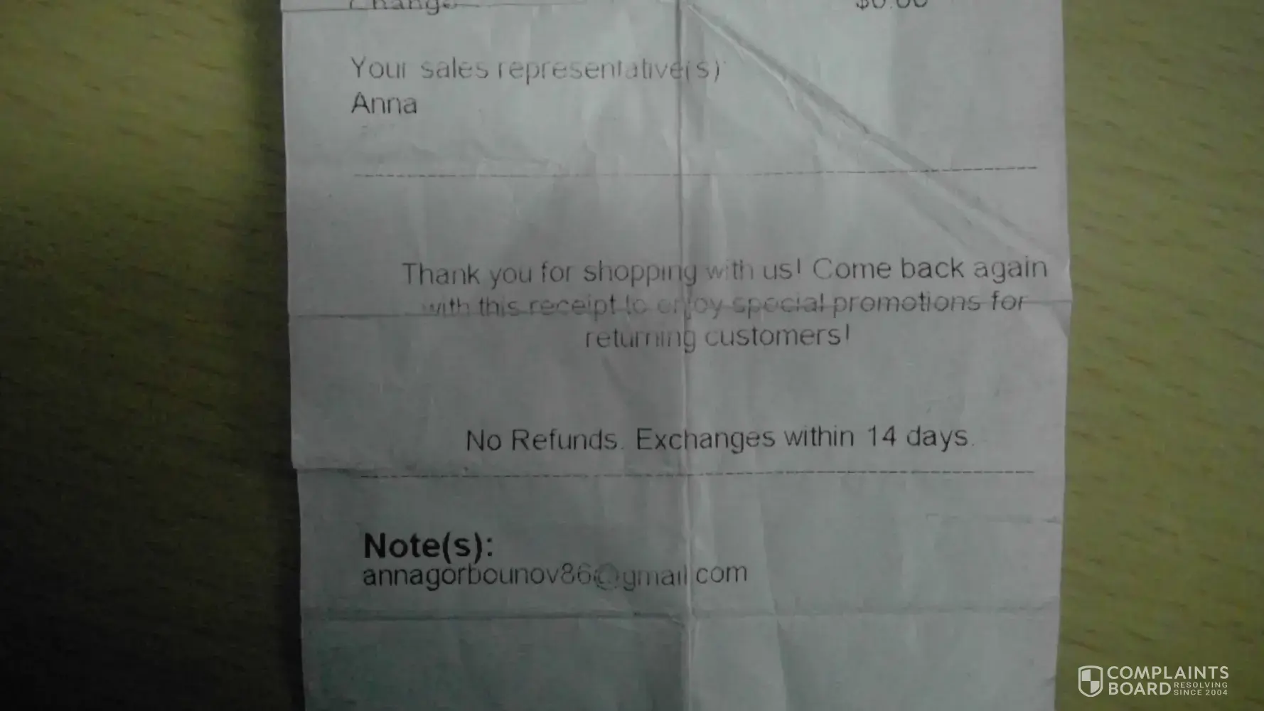 I was running late to meet my son and his family for dinner and I just wanted to get out of there. Tasion told me the products were guaranteed and I could bring them back for a refund. He brought the receipt to me to sign and I was never at the sales counter where they supposedly have a sign that says no refunds. I didn't even look at the receipt as I signed it, I was late and needed to get out of there. Actually, I was exhausted and beating down. Taison told me he would send me the information since I had to leave, on how to use the products by email along with a schedule. I never received anything from him.