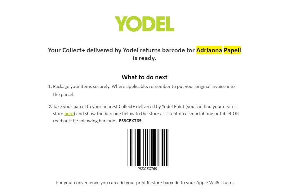 Unfortunately, the parcel was sent back to my address despite me taking it to a Yodel store and the store assistant scanning the barcode and taking the parcel with no issues.