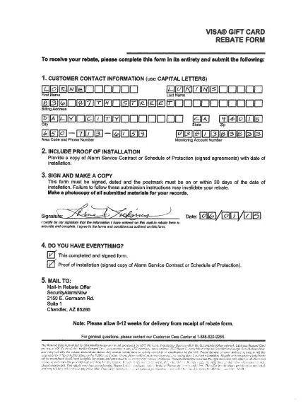 On May 30, 2015 I had a security system installed by ADT with the provision that I would receive a $100 VISA Gift Card with my installation. I was to "...allow 8-12 weeks for delivery from receipt of rebate form." I sent my rebate form on June 1, 2015; receipt of which was acknowledged by ADT. It is now January 5, 2016, over 32 weeks later, and no gift card received. I have made numerous calls to ADT but have only received failed promises of delivery. My last call to them on January 5, 2016 was not returned within their 24-hour time period. To ADT, please send me my $100 Visa Gift Card according to our agreement.