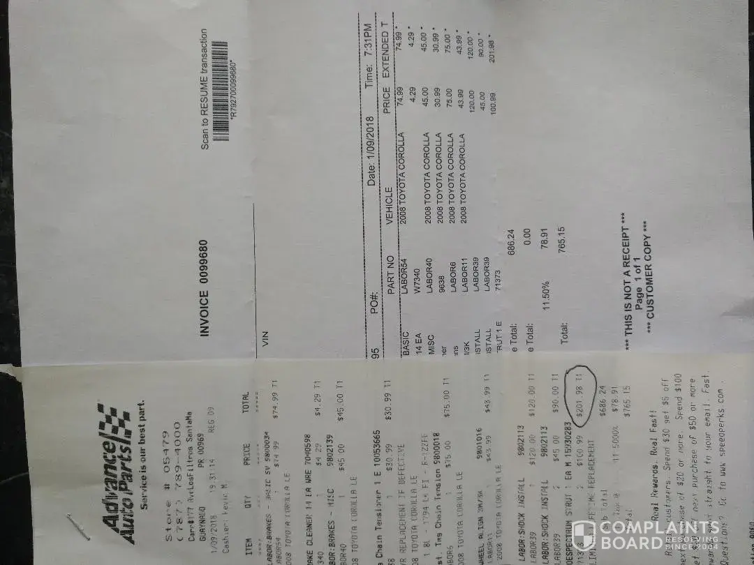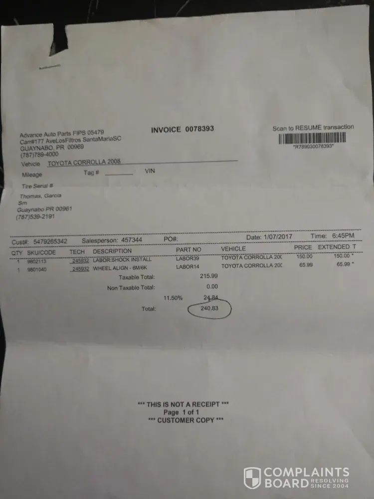 On January 7, 2017, I had my 2008 Toyota Corolla CE serviced at your Advance Auto Parts FIPS 05479, Carr#177, Ave. Los Filtros Santa Maria Shopping Center, Guaynabo, PR 00969 store. I purchased and replaced the rear shocks. First I paid for the parts because they did not have the two shocks in stock, so, I had to pay for the parts to have them delivered to the store. Later on the same day I had the shocks replaced on the car.