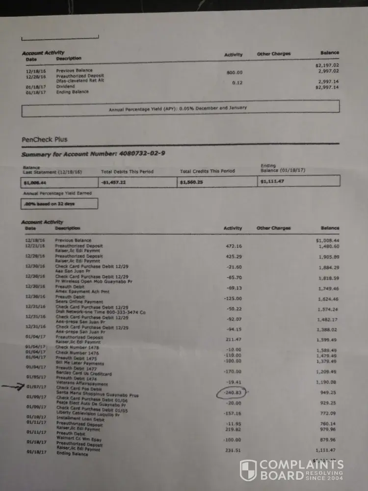 - Copy of Bank Statement showing charges paid ($240.83) PenFed Credit Union.