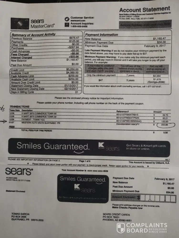 - Copy of Bank Statement showing payment for the Shocks ($222.98) Sears Mastercard