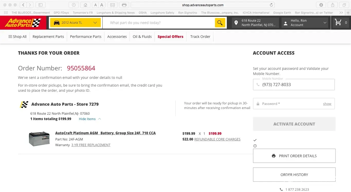 Yesterday (02 September) I purchased a Platinum CarCraft battery online, with the understanding that I could get it installed the next day at your North Plainfield, NJ store. The cost was $236.70, which was inclusive of the battery, its installation, taxes and a recycling fee.