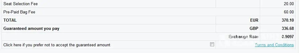 My complain: Since the exchange rate doesn't vary often, Aer Lingus is getting 3% extra of every transaction if the user doesn't tick the box. In other words, 12 Euros extra for every 400. The design of the website is conceived with the intention of misleading and lead the user to the default choice which is more beneficial for Aer Lingus.