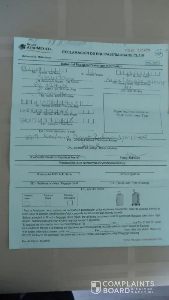 Aeromexico no information regarding my missing baggage since 21 april 2018