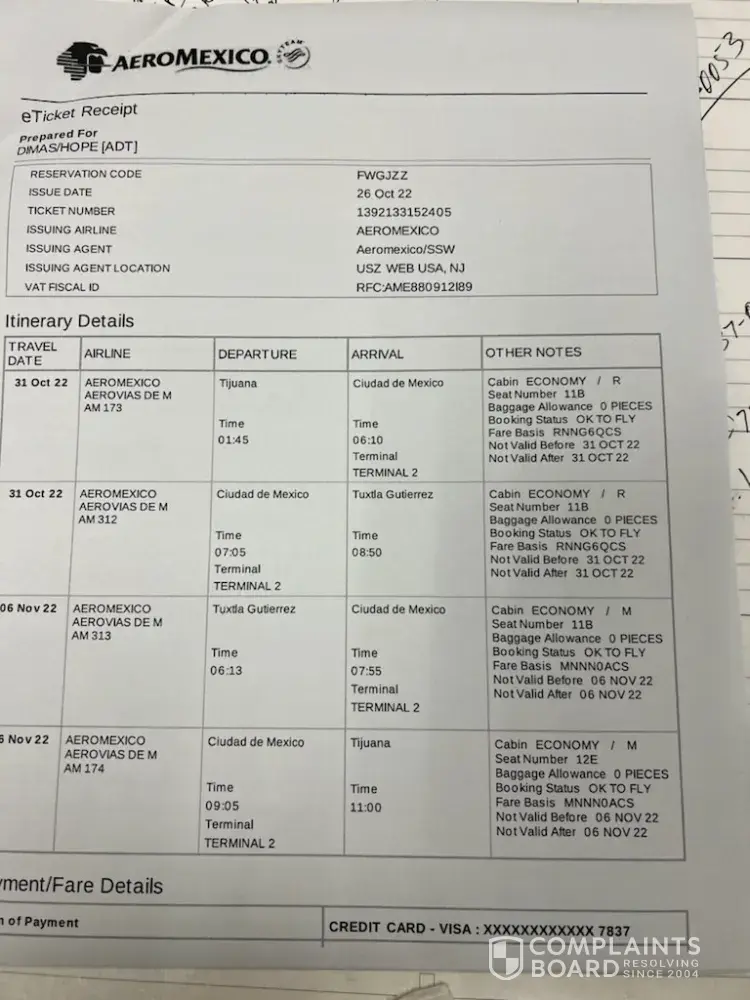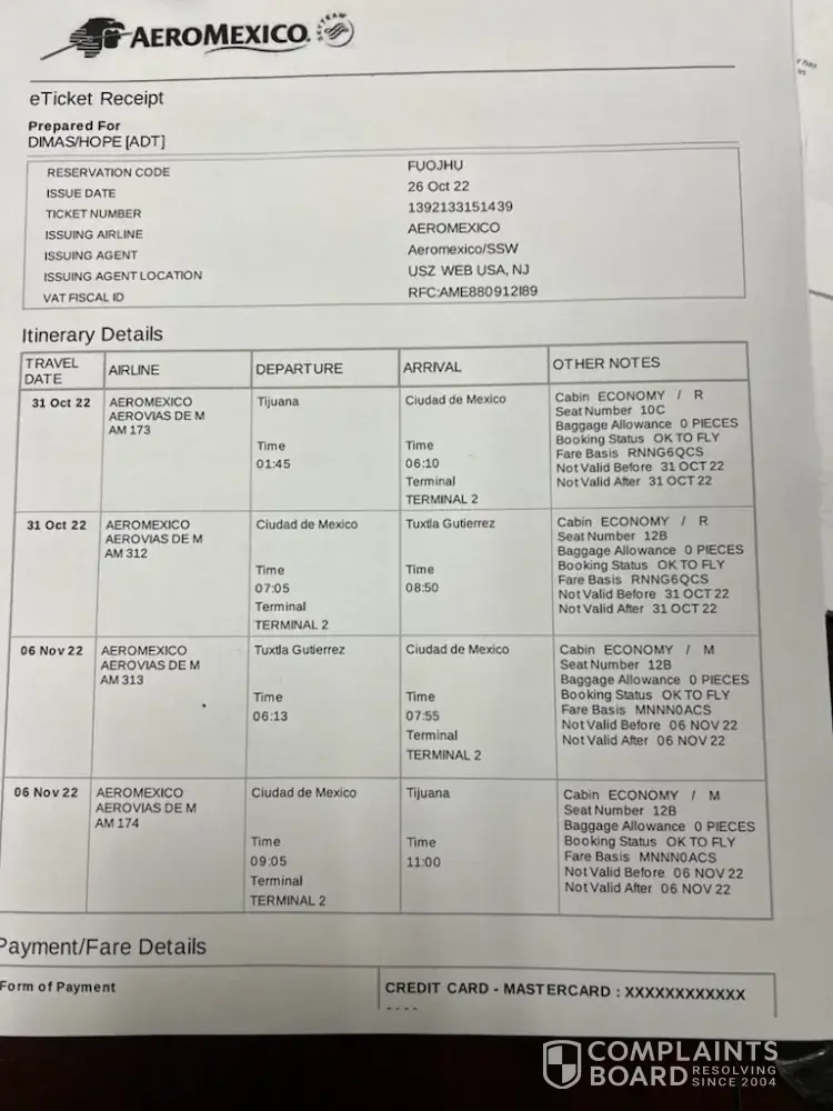 Desired outcome: credit to future flights on Aeromexico, $10,000 pesos.Club memmebr # [protected]