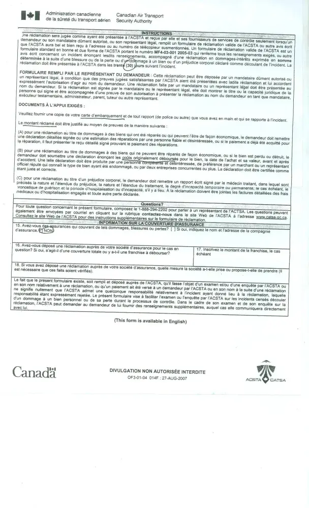 Cette lettre est pour vous informer de l’incident survenu le 22 avril 2011 à l’aéroport pierre-elliott trudeau vers 8h19am. ce dernier a eu lieu au comptoir des douanes d’embarquement et vérifications des bagages à main.