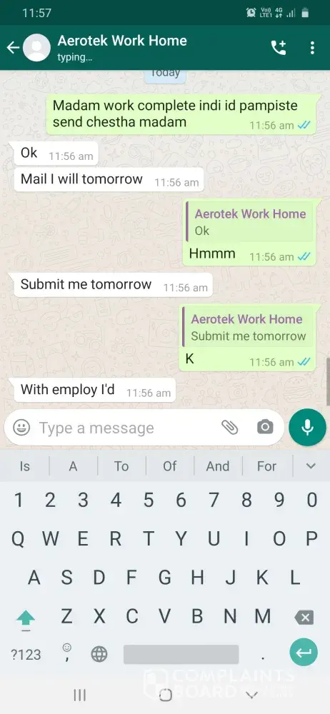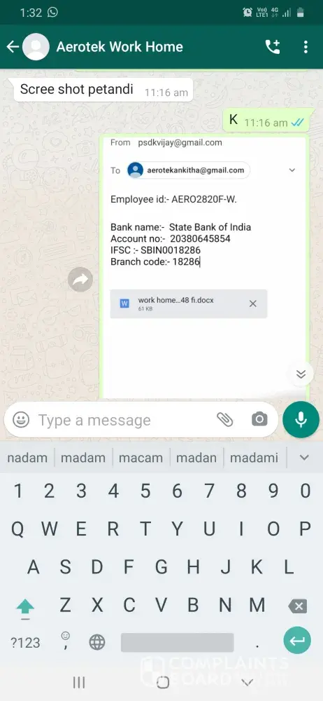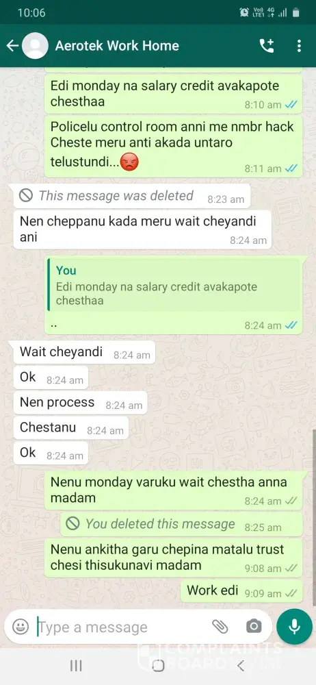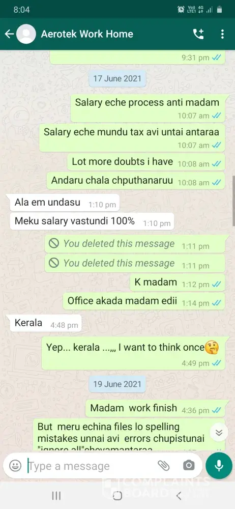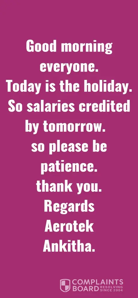 I Pappala Swamy Devendra Kumar Vijay, completed "B-tech mechanical" in the year of 2017. Actually, I saw some cheating experience from past 15 days. One day I get a call from Anikitha Garu and she said I am working in Aerotek company., She asked do you want to do a work from home job. I said yes, she gave an "Aerotek" "MS Word" projects you should be completed in 15 days that's she said and given some fake employee ID also. And I believed her and taken the project and completed in 15 days. So, finally I submitted the project to her mail address and she said wait for 3days. I sincerely waited 3 days, she called me and said your accuracy is 98 percent and you will get 47000 rupees... And taken my bank details... She never credited the salary... So I am taking step to complain to "police about your company fraud" and complaint to the company for the employees creating fraud to other peoples by the brand of your company... So please take an immediate charge on this and punish them and credit my salary. I am going through complaint a file in police station and I approach a lawyer.