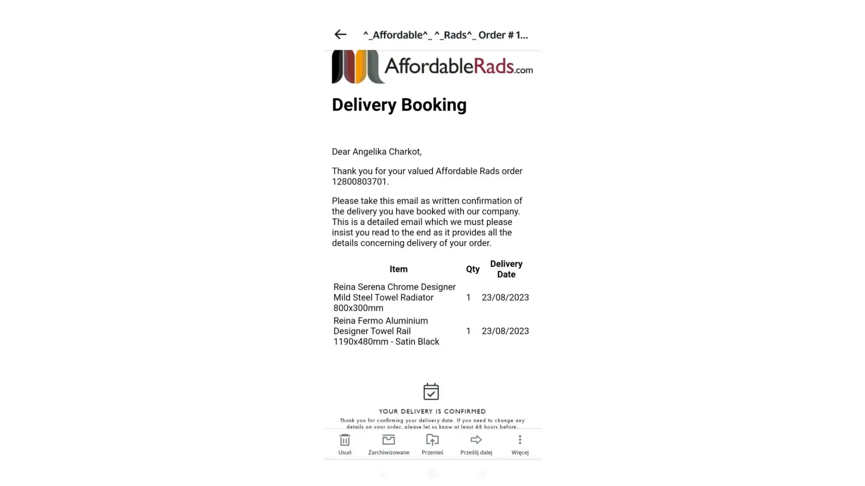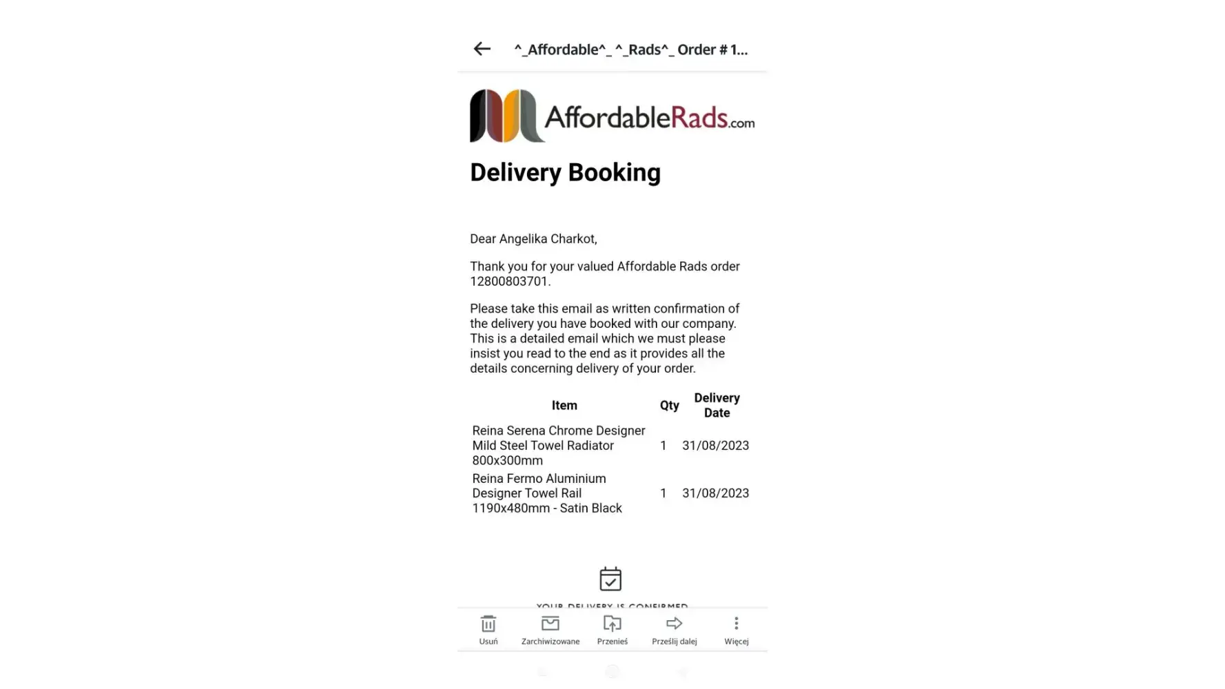 Affordable Rads Unable to contact the company regarding delivery of my order