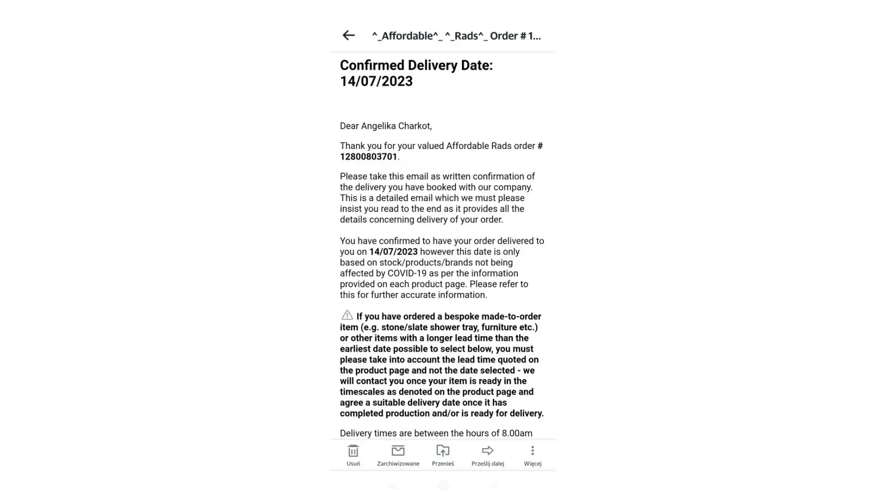Delivery of my order was supposed to be 31 Aug 2023. Till date no responses when they will deliver etc. Had to pay plumber to come as per their advised date and then no delivery . Radiators are not as affordable as it says after paying the plumber. All I want is delivery date and time.? Order number [protected].. Taken the money . Can't talk to them on line chat puts you on for hours.