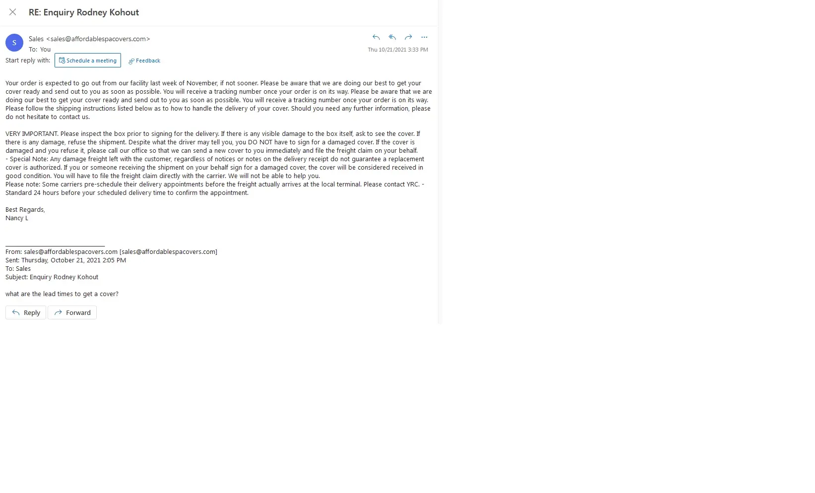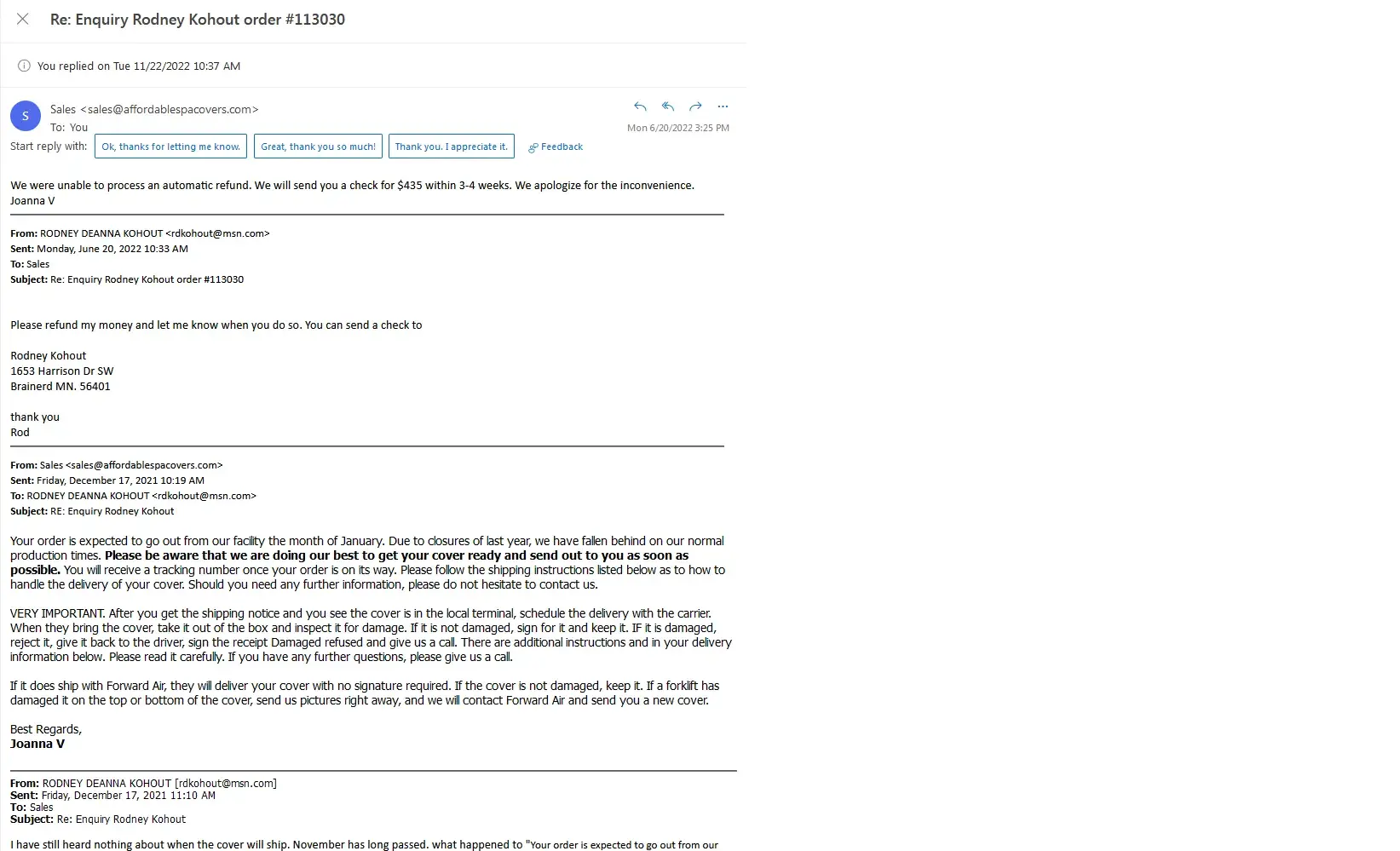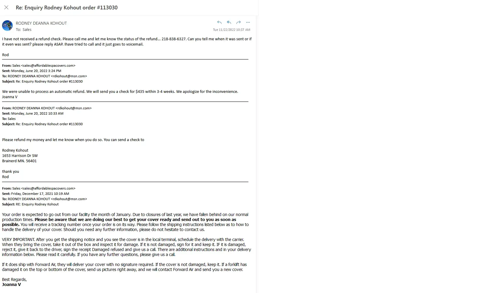 From this e-mail thread, you can see that I repeatedly reached out to you about the status of our order placed 4/29/21. I did call to cancel the order on April 11, 2022, and was not told about the $150 cancellation fee at that time; instead I was assured that it would just be a "few more weeks" until my cover order was ready to ship.