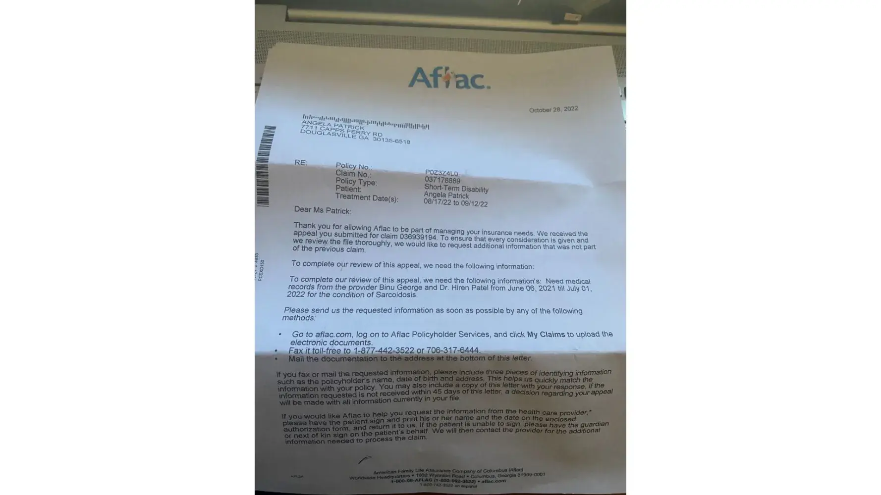 8/26/22, the same day I was told about the form. I reached out to Aflac customer service, and they sent the form via email and informed me that on the back of my denial letter, there was an opportunity to appeal the initial decision. By 8/29/22 my employer had filled out the necessary form and sent it to Aflac and I sent my appeal in on 8/26, which means they now had all of the paperwork they needed.