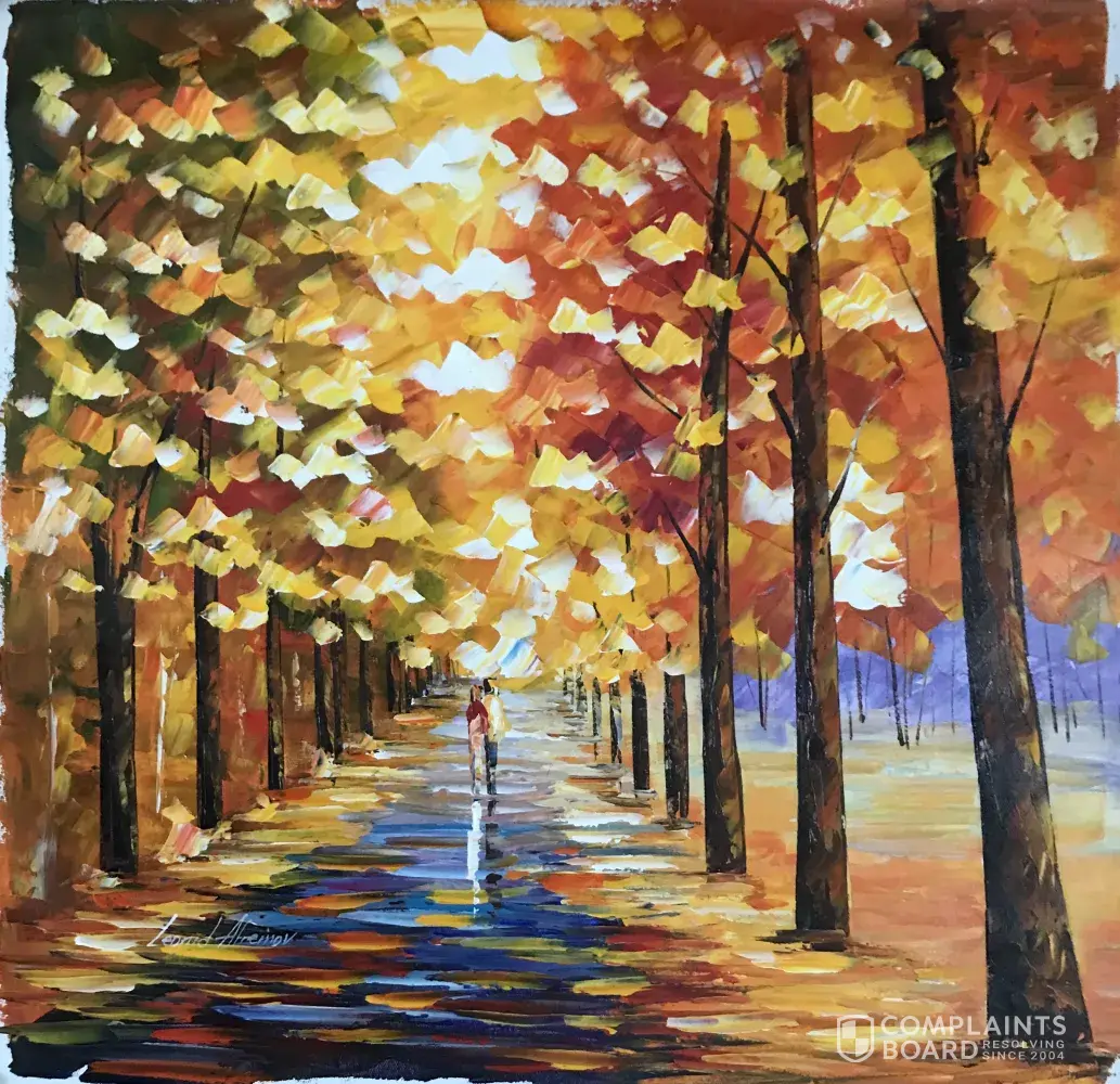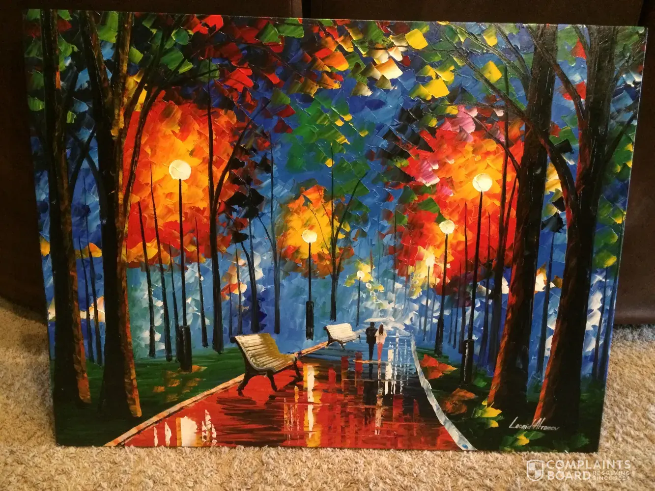I also bought 3 paintings from Leonid Afremov, the first one I received was absolutely beautiful! I love it soo much. I ordered 2 more and the are absolutely disappointing. Both lacked detail, depth, and pride. Unfortunately, I will not buy anymore paintings from Leonid. I think he has gotten to the point he will risk the pride in his work in order to fill in the orders. Which is certainly not a good practice as an artist. I am an art collector and have various artist paintings in my house. I will not be displaying Leonid Afremov's art as it does not come close to being artist quality.