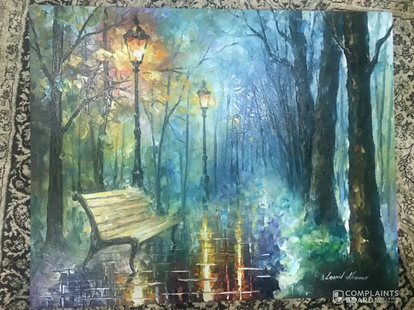 I purchased one of his reproductions through his auction afremov.com during a Black Friday special he was having. I paid nearly $300 for "Morning Mood". The painting I received looked nothing like the image on the auction. My painting looks like a child painted it and the colors are way off and that destroys the effect I was attracted to in the picture. I paid extra to have the canvas stretched onto a frame, and again it appears that a child has attempted to do this...it is wrinkled. I am very disappointed with my purchase and even more disappointed to read of so many other unhappy consumers. The original artwork is absolutely gorgeous and he should have no reason to scam people.