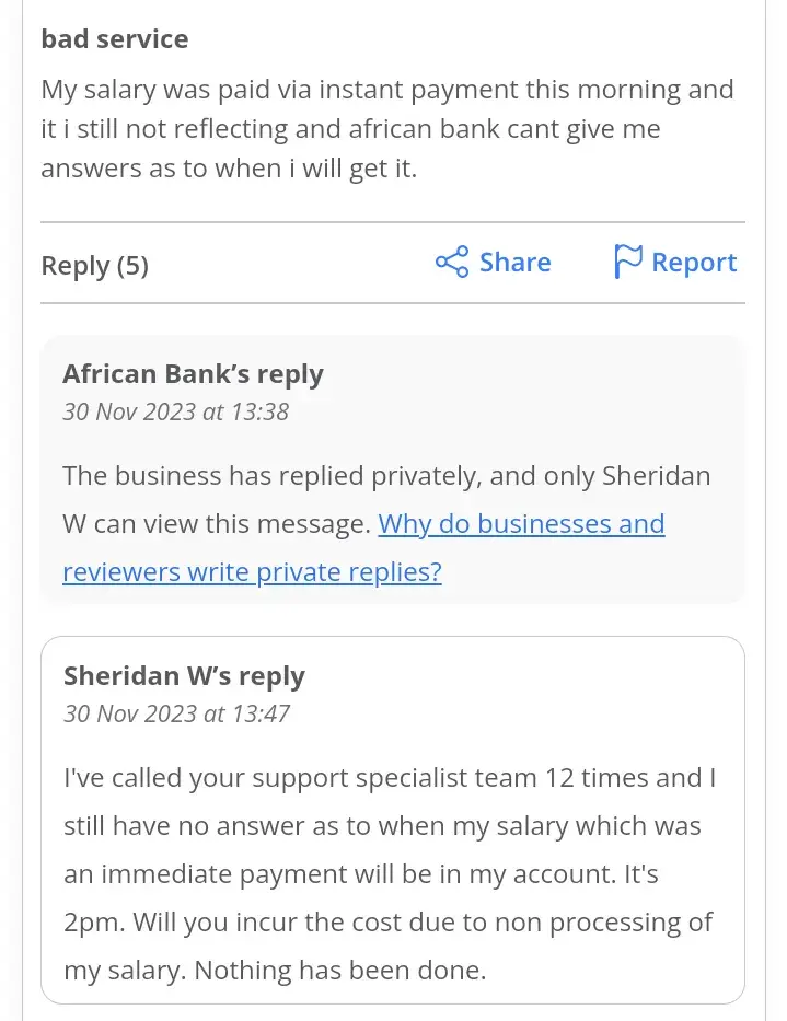 - While African Bank has a high level of trust, our investigation has revealed that the company's complaint resolution process is inadequate and ineffective. As a result, only 3% of 100 complaints are resolved. The support team may have poor customer service skills, lack of training, or not be well-equipped to handle customer complaints.