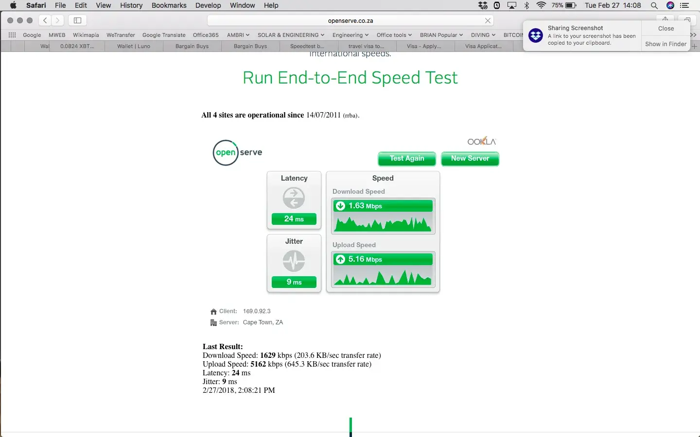 This shows the speed results a few minutes ago on a 20 Mbps Open Serve fibre package with Download speed 20Mbps and Upload speed 10Mbps.