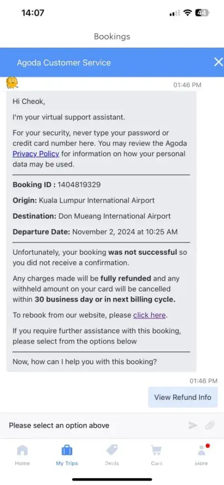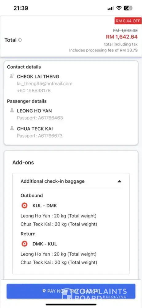 I had placed booking on 07th Oct 2024 with ID: 1404819329 & [protected]. I had placed my booking for round trip with total RM1642.64 (KUL - DMK)!