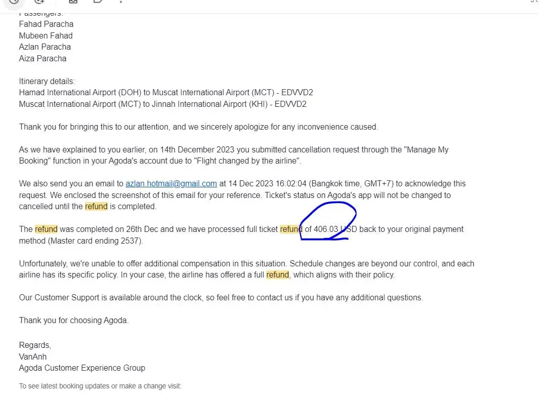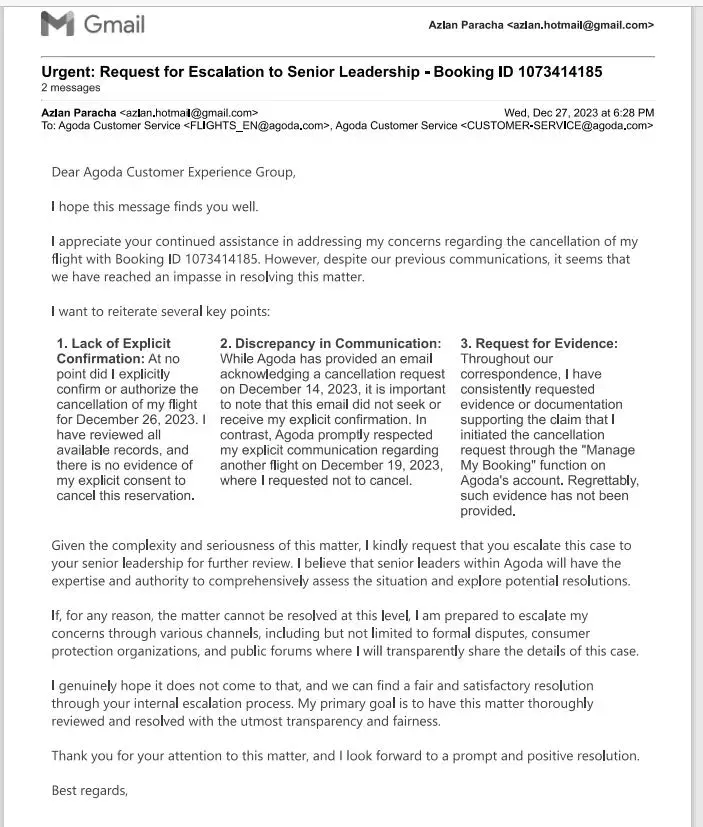 During the same period, I had open communication with Agoda regarding a separate flight from Karachi to Doha on December 19, 2023. I explicitly requested not to cancel this flight, and Agoda promptly acknowledged and respected my request. It is my belief that due to a possible oversight or system error, the Agoda team mistakenly associated the communication about the December 19 flight with the December 26 reservation. This error led to the unilateral cancellation of the December 26 flight without my explicit consent, causing this entire episode. Unfortunately, Agoda has chosen to place the blame on me, despite the lack of evidence supporting their claim.