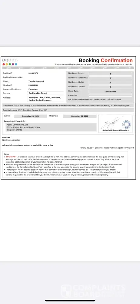I booked for a hotel room with Agoda on 12 December 2021 at Caribbea Bay resort in Zimbabwe. The check in date was suppose to be 24 December 2021 and check out date 26 December 2021, on arrival the hotel did not accept my booking. They said they to not have any contract with Agoda.