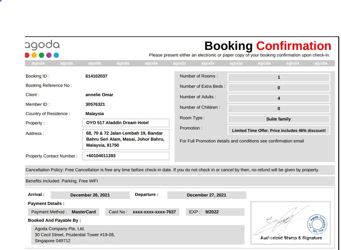 I arrived at Oyo Aladdin Dream hotel (Masai Johor, Malaysia) on 26th Dec 2021 and was informed that they are no longer accepting online booking and they have ended their contract with Agoda.