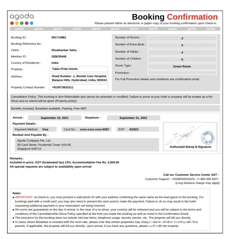 In regard to your Agoda Booking ID 541306449