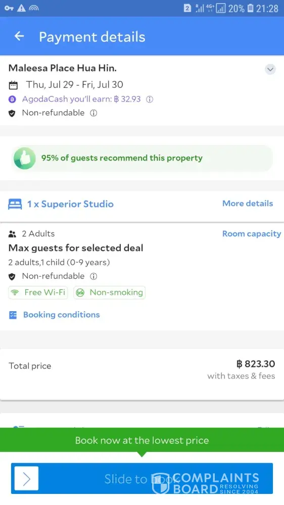 After appealing to both the hotel and to agoda customer service, I was met with resistance. Adter second email, agoda offered an agoda cash coupon of half of the room cost redeemable on any future credit card booking with Agoda.