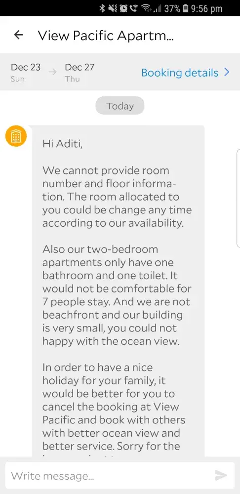 Provider is asking to cancel booking after confirmation. It was clearly mentioned on the ad as an ocean view superior room with View pacific hotel surfers paradise when I did the booking now they have come back to me asking to cancel the booking(all docs attached) stating its not a beachfront room and may not be satisfactory for 7 people.During the busy season of christmas when its do hard to find bookings its so disappointing to face this kind of am inconvenience. This is absolutely ridiculous and Iam not going to use agoda ever again as I had done the booking through them.This is an unprofessional conduct and Iam going to write on social medi to make people aware of such a terrible experinece.