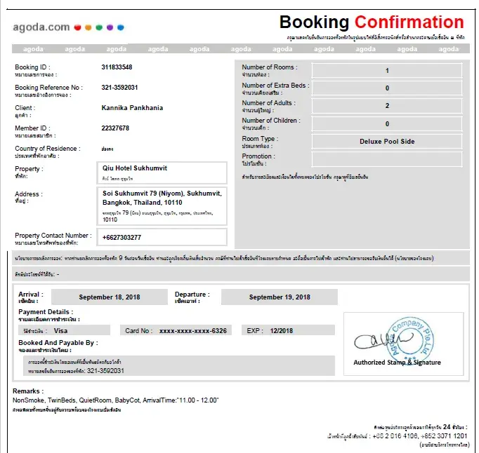 Booked a hotel on agoda on 22 Sept.
