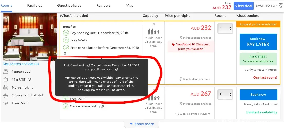 We have several screenshots from your website that clearly state 'free cancellation' and 'risk free booking'.