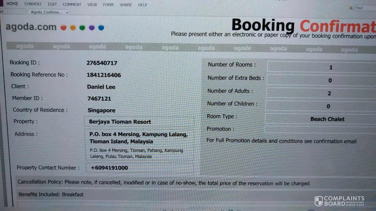 I booked on on 3rd Jun a Non-cancellable Member's promotion for a Beach Chalet via Agoda.com website for 24th Jun - 27th Jun 2018 at Berjaya Resort, Tioman Island, Malaysia.