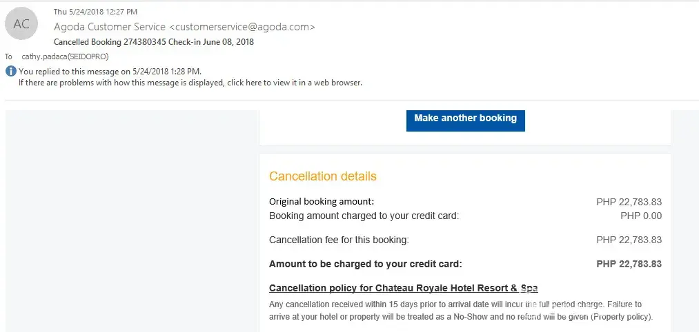 I cancelled my reservation in Agoda because I already decided to book directly to the hotel. I booked thru Agoda yesterday but my Check In Date at the hotel is June 8 and I cancelled it today so that they will not charge me anymore because technically its still 16days prior to arrival date but still, they charged me thru my credit card.