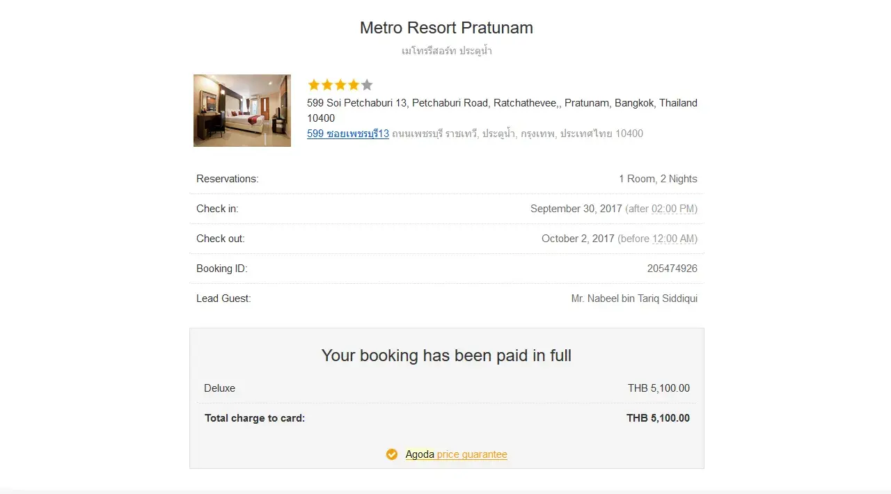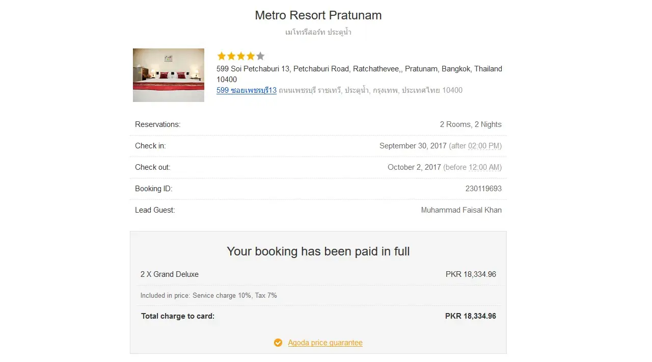 i attached two booking.. i booked hotel in bangkok metro resort pratunam and recommend my friend to booked the same hotel he made the booking after two hours. they got 2X grand deluxe room in same price in which i booked one room deluxe...i paid 5200 bath for two night one deluxe room and my friend booked 2 room X grand deluxe in 18000 which is almost 5803 bath...