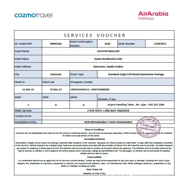 Bad experience with air arabia I lost my 4 days salary as well as I spent money double pcr test for family,taxi,hotel, please compensate everything ASAP. If you I will share the documents.